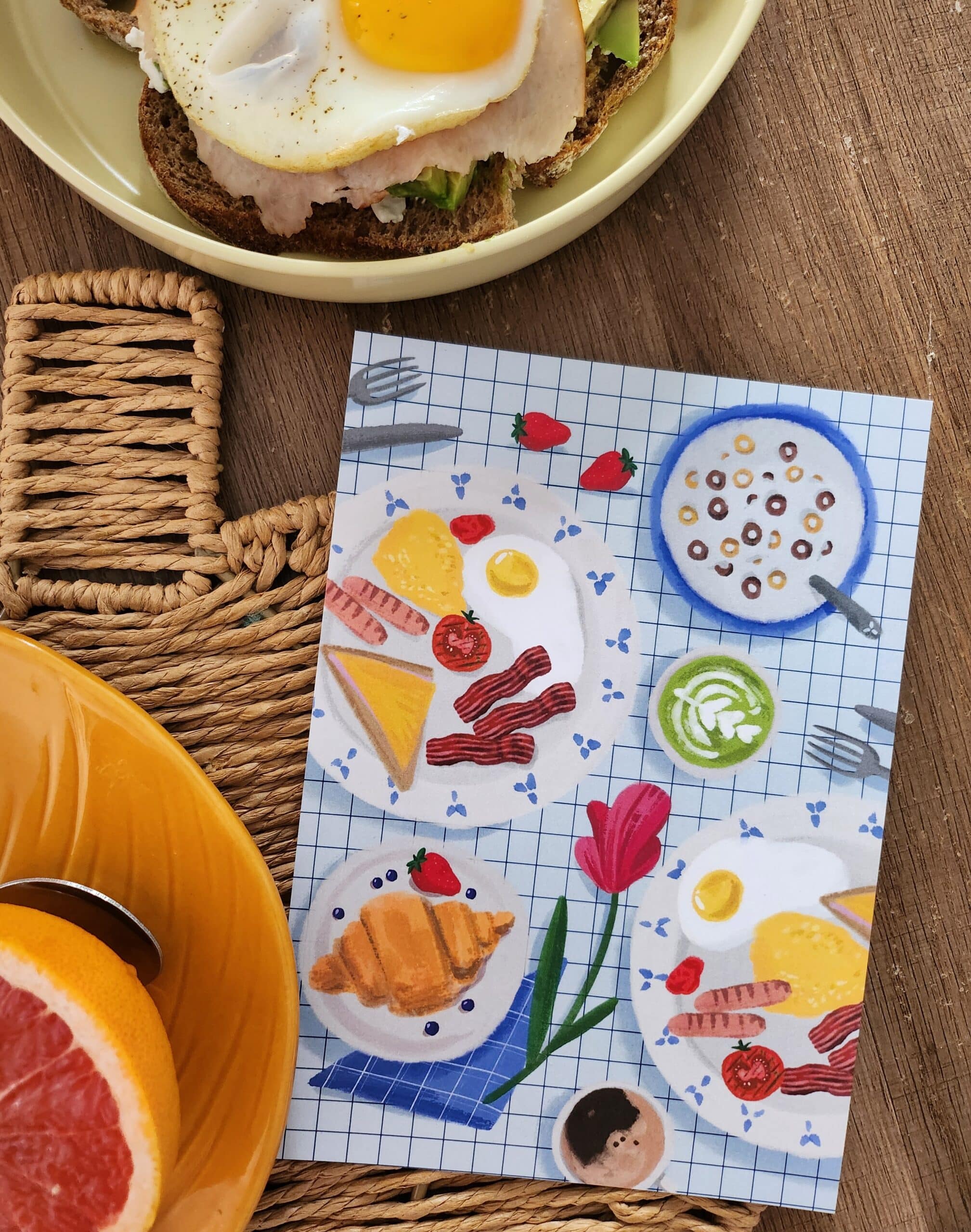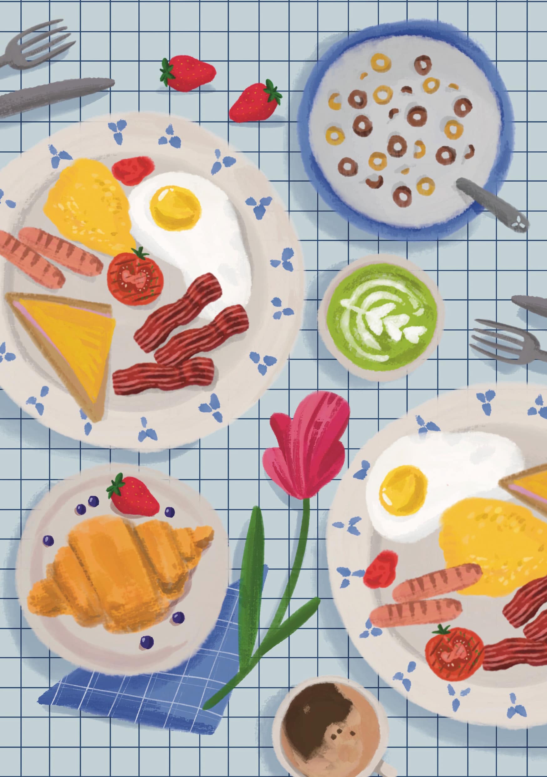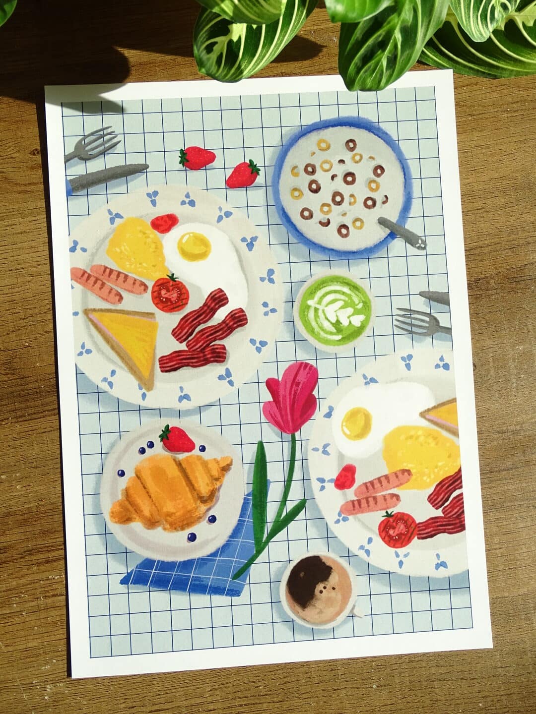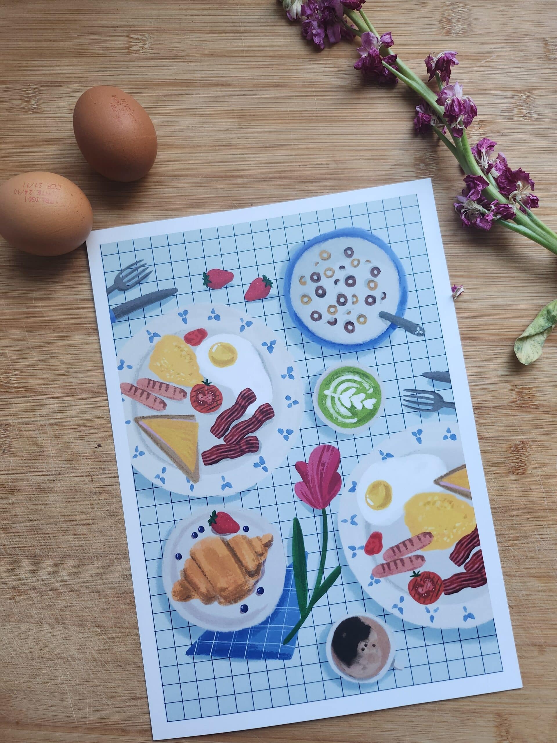 Cette affiche pleine de détails raconte une scène de petit déjeuner simple et joyeuse.