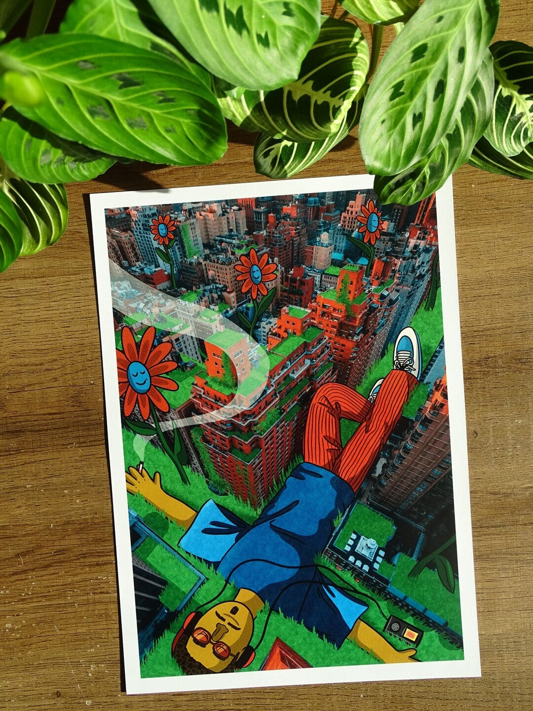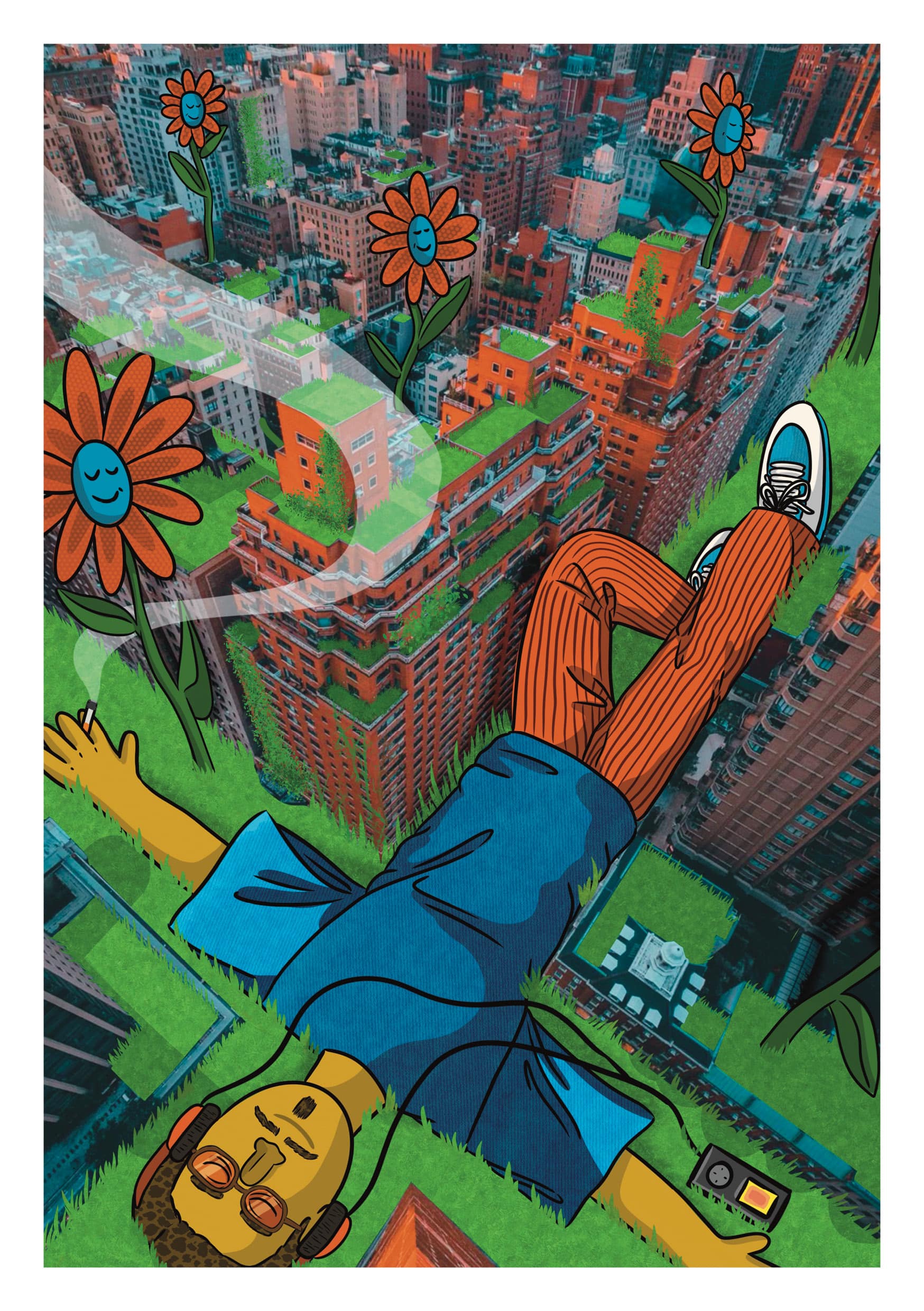 Cette affiche Urban Chill représente un personnage plongé au-dessus de la ville, casque sur les oreilles, dans une ambiance urbaine vibrante et colorée. Une scène entre collage urbain et illustration pop, où la ville se transforme en terrain de jeu coloré. Une affiche vibrante, décalée et pleine d’énergie.
